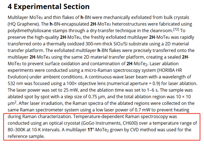 2025年3月,中国科学院物理研究所使用果果仪器ECH400V等设备探索激光诱导MoTe₂相变的技术方法,成功地实现了可控的、高质量1T'-MoTe₂的制备,并通过变温拉曼光谱技术系统研究了1T'相的低温相变行为,发现其向Td相的转变温度与Te团簇浓度呈负相关,为二维材料横向异质结的可控制备与调控提供了解决方案。相关工作发表在Controllable Laser-Induced Phase Transition in Multilayer 2H-MoTe2 and its Raman Spectroscopy Study, Adv. Electron. Mater. 2025, 2500064。