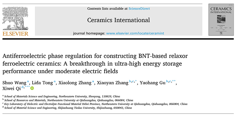 文章名:《Antiferroelectric phase regulation for constructing BNT-based relaxor ferroelectric ceramics: A breakthrough in ultra-high energy storage performance under moderate electric fields》