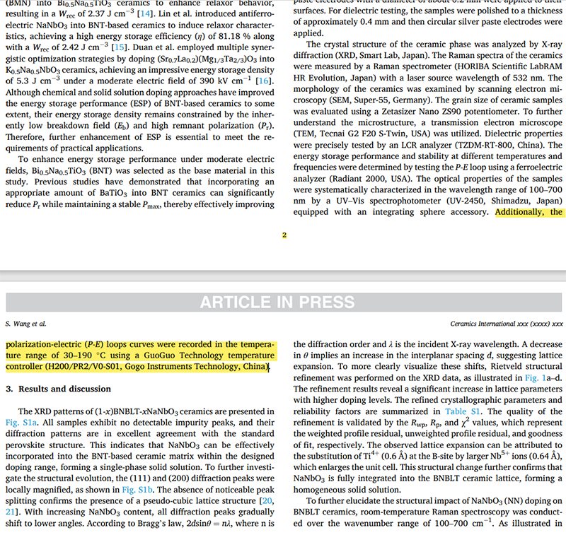 东北大学材料工程团队提出将反铁电材料掺入弛豫铁电陶瓷中,构建了铁电-反铁电二元固溶体。并在 400 kV·cm-1 中等电场下实现了 89.4%的优异储能效率,同时具有卓越的热稳定性和频率稳定性。其中,果果仪器的H200/PR2/V0-S01 变温铁电测试仪作为核心设备,为该研究的热稳定性和频率稳定性提供了精准支持,助力科研团队突破测量技术瓶颈。