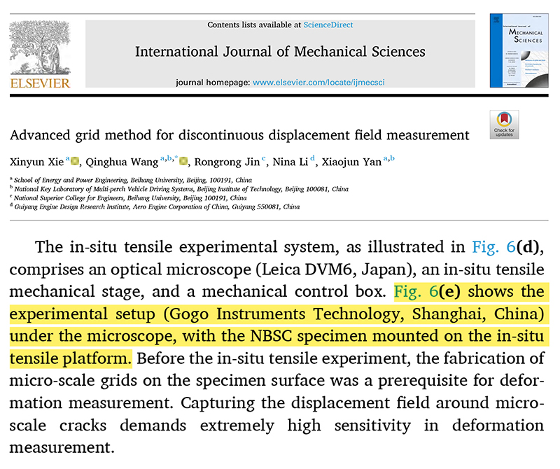 上述实验得以实现,离不开GoGo Instruments Technology(上海)原位拉伸实验装置的关键支撑。该装置与数字光学显微镜联用,构成完整的原位观测系统,能够在不中断加载的条件下对试样缺口区域进行连续实时成像。其同步对称拉伸机构确保了加载过程中观测视野的稳定性,内置力-位移传感器同步记录工程应力应变曲线,为位移场演化与载荷状态的精确对应提供了可靠保证。正是凭借该装置对微裂纹萌生至断裂全过程的不间断捕捉能力,研究团队得以获得完整的全场位移演化序列,实现了NBSC高温合金不连续变形场的首次定量表征。