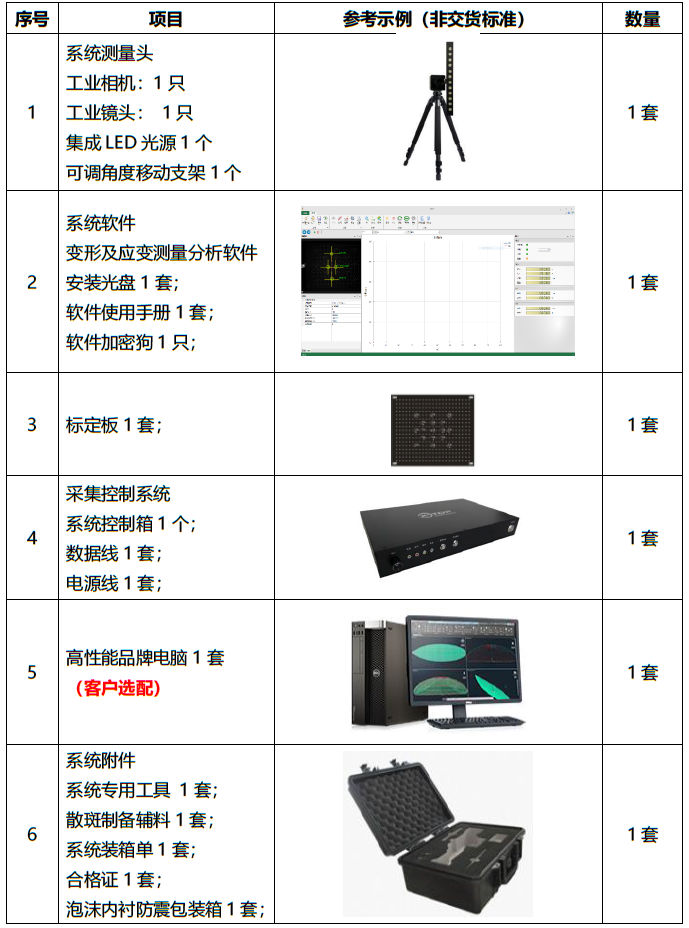 系统组成:系统测量头(含1台工业相机、镜头,带万向手柄可调节LED光源)、相机同步控制触发控制箱、系统标定板、系统可移动支撑架、动态采集分析软件、载荷加压控制通讯接口、计算机系统(用户选配)等组成。