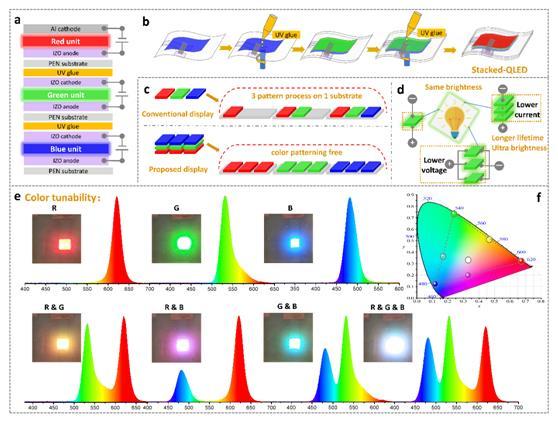 该工作为实现新型叠层 QLED 以及开发可单独寻址全色显示和照明器件提供了一种新的实施策略。