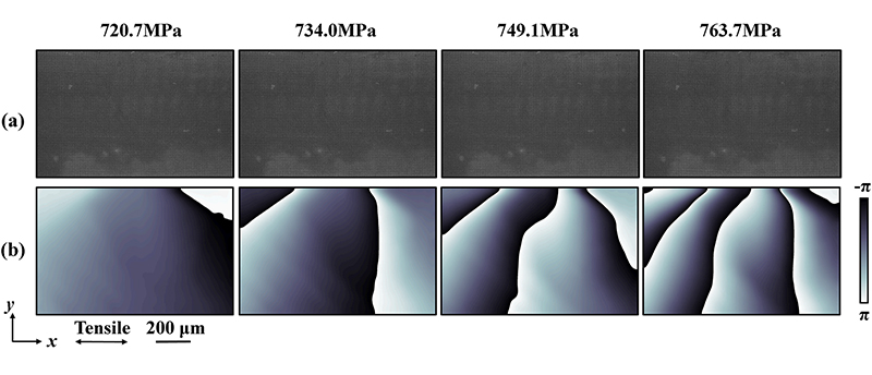 ● 拉伸载荷达763.7 MPa时,光栅完整附着于基底,精准揭示了缺口下方45°对称区域的应变集中与滑移带演化。