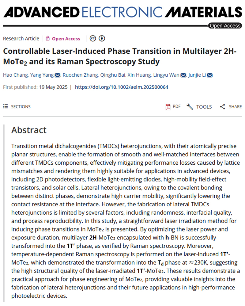 2025年3月,中国科学院物理研究所使用果果仪器ECH400V等设备探索激光诱导MoTe₂相变的技术方法,成功地实现了可控的、高质量1T'-MoTe₂的制备,并通过变温拉曼光谱技术系统研究了1T'相的低温相变行为,发现其向Td相的转变温度与Te团簇浓度呈负相关,为二维材料横向异质结的可控制备与调控提供了解决方案。相关工作发表在Controllable Laser-Induced Phase Transition in Multilayer 2H-MoTe2 and its Raman Spectroscopy Study, Adv. Electron. Mater. 2025, 2500064。
