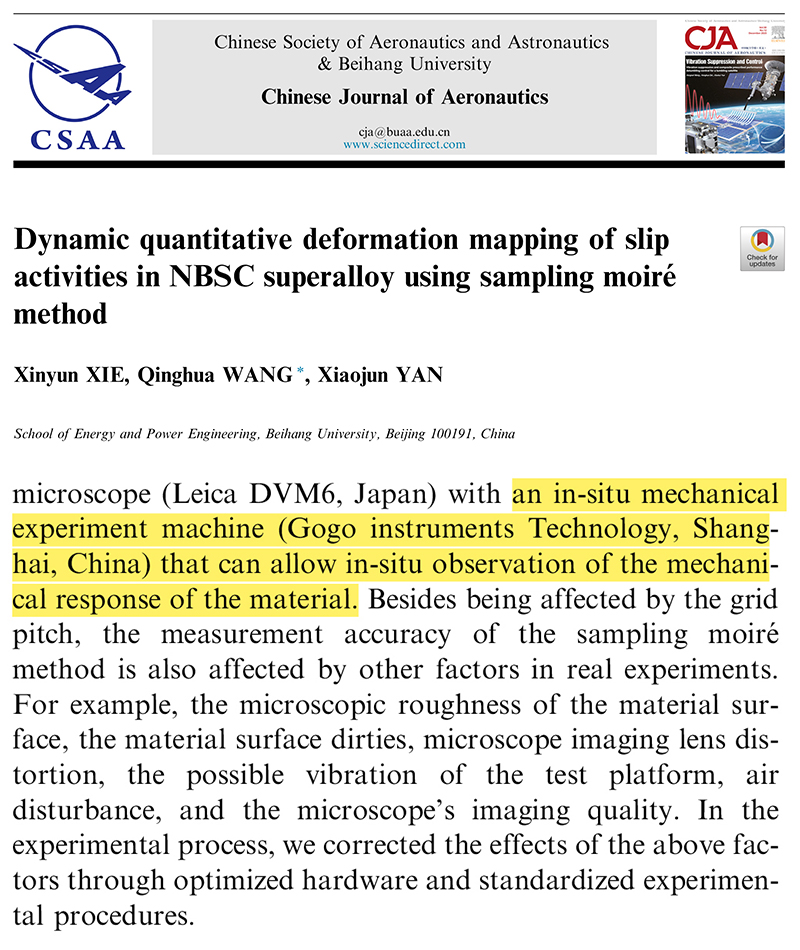 上述实验得以实现,离不开GoGo Instruments Technology(上海)原位拉伸实验装置的关键支撑。该装置与数字光学显微镜联用,构成完整的原位观测系统,能够在不中断加载的条件下对试样缺口区域进行连续实时成像。其同步对称拉伸机构确保了加载过程中观测视野的稳定性,内置力-位移传感器同步记录工程应力应变曲线,为位移场演化与载荷状态的精确对应提供了可靠保证。正是凭借该装置对微裂纹萌生至断裂全过程的不间断捕捉能力,研究团队得以获得完整的全场位移演化序列,实现了NBSC高温合金不连续变形场的首次定量表征。