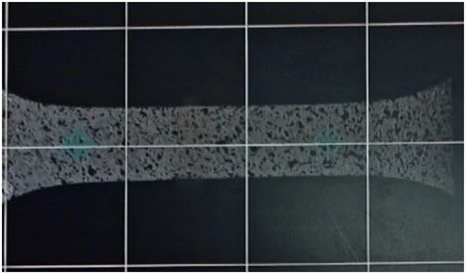 (1) 通过专用的小试样散斑喷涂装置,制作散斑涂层。当然,也可以通过画线等方式制作标记,视频引伸计均可支持,但制作散斑涂层后面还可以扩展到其他用途,所以我们建议处理为散斑涂层。制作完成的试样类似下图。