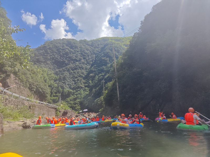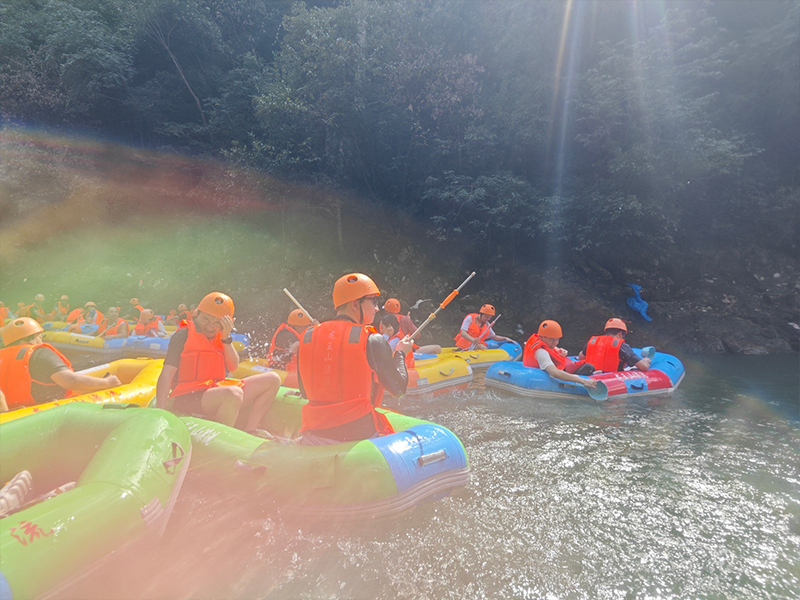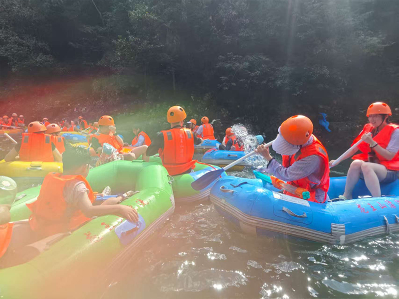 漂流开始了。起初水面平静,大家尚能悠闲地欣赏风景。不料下一个转弯,水花四溅!不知是哪一艇先开了战,水枪、水瓢齐上阵,顿时水花漫天,几乎看不清谁是谁。平日里正襟危坐的同事,此刻正被别的同事围攻着,淋得像个落汤鸡,却笑得十分开怀。水花在阳光下折射出七彩光芒,映照着大家的笑脸。