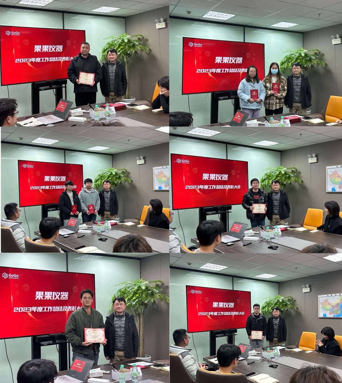 2023年公司也涌现出在工作中有突出表现的一些优秀员工,年度工作总结会结束后,果果仪器2023年度表彰大会正式开始,汪总亲自为优秀员工表彰颁奖并合影。