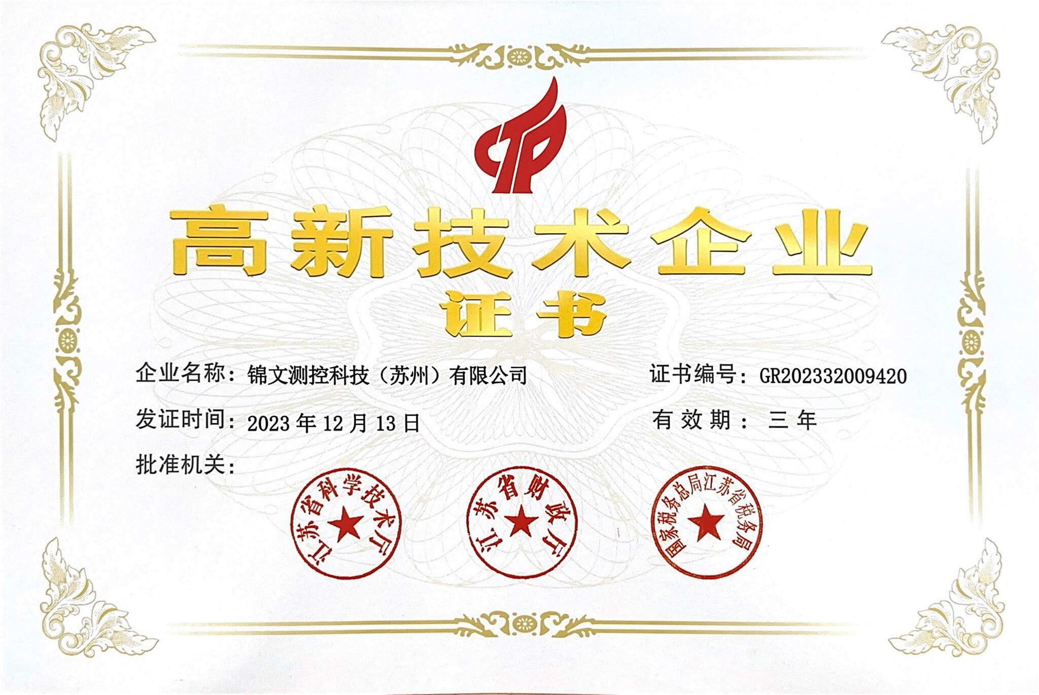 近日,果果仪器子公司锦文测控科技(苏州)有限公司顺利通过国家高新技术企业认证,成为2023年江苏省第二批高新技术企业,正式踏进国家高新技术企业行列。